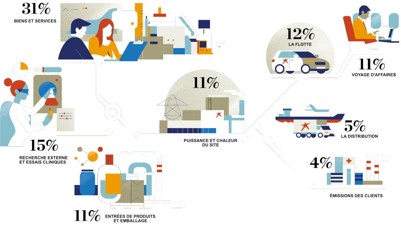 Notre objectif actuel de CO2 est une réduction de 70 % d'ici 2035 par rapport à 2016. Nous avons obtenu d'excellents résultats sur nos émissions directes (objectif 1) et sur nos achats d'électricité et de chaleur (objectif 2). Cependant, plus de 90 % de nos émissions totales de CO2 proviennent de notre chaîne de valeur (objectif 3). Cette chaîne inclut la production des produits et services dont nous avons besoin, la distribution de nos produits aux patients, les déplacements de nos employés et la manière dont nos déchets sont traités.
