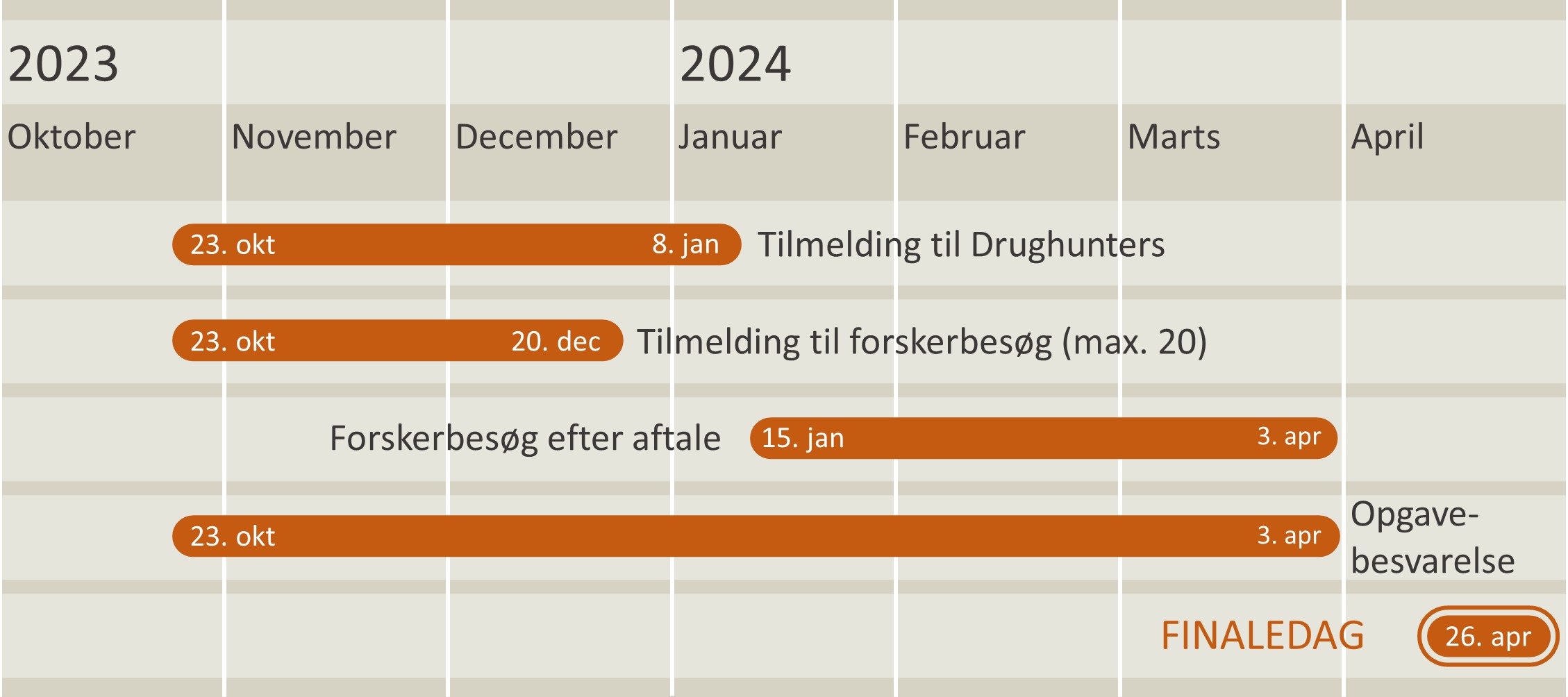 Elevers og læreres evalueringer af arbejdet med Drughunters viser stor tilfredshed med at arbejde i de differentierede grupper. Forløbet i en 2g, hvor der er SRO’er, studierejser, terminsprøver og AT mv., kan blive meget fragmenteret. Det er uhensigtsmæssigt, når eleverne arbejder med et projekt, hvor en del af det supplerende stof er ret svært. Hvis det er muligt, så bør projektet lægges i en nogenlunde sammenhængende periode, meget gerne hvor der er en hel dag til at arbejde koncentreret med posteren.