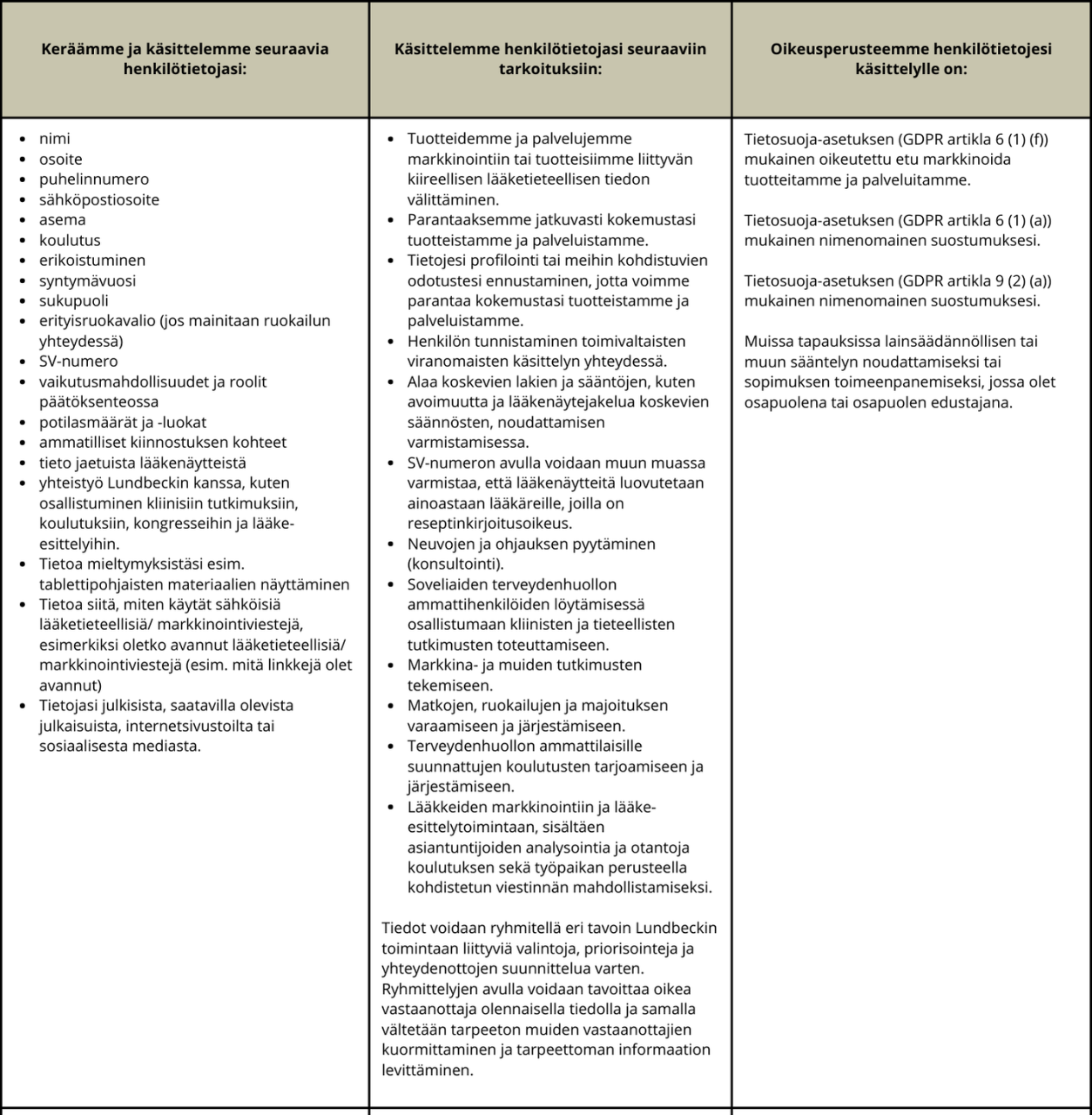 · GDPR artikla 6 (1) (f). Lundbeckin oikeutettu etu henkilötietojesi luovuttamiselle