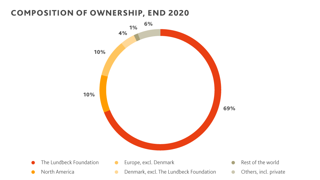 Lundbeck's largest shareholder is the Lundbeck Foundation, which owns roughly 70% of the shares in Lundbeck, while the remaining 30% are traded on the stock exchange. Lundbeck is divided into six divisions, and is managed by an Executive Management team and a Board of Directors.