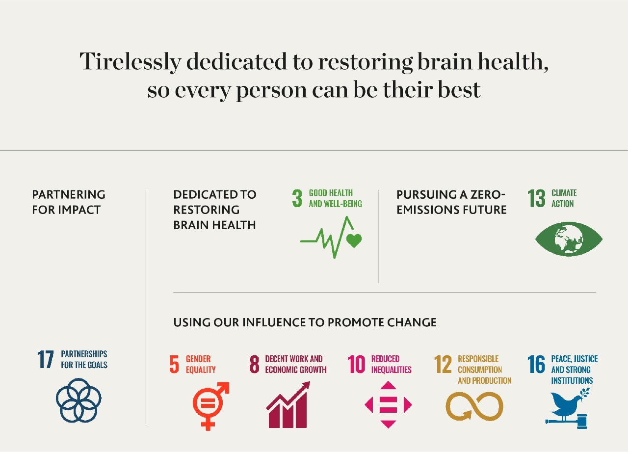 In particolare, è per noi fondamentale l’Obiettivo 3, strettamente legato al nostro scopo aziendale e al nostro impegno per il ripristino della salute psichiatrica e neurologica. L’Obiettivo 13 guida i nostri sforzi verso un futuro a zero emissioni.