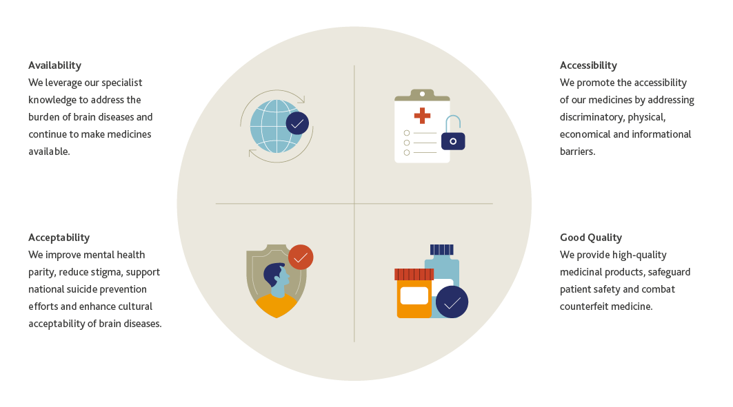 Building on more than 70 years' experience in the research, development and manufacture of medicines for treatment of brain diseases, Lundbeck is consolidating its corporate actions into an Access to Brain Health Strategy. It is inspired by four right to health principles from WHO: Availability, Accessibility, Acceptability and Good Quality.
