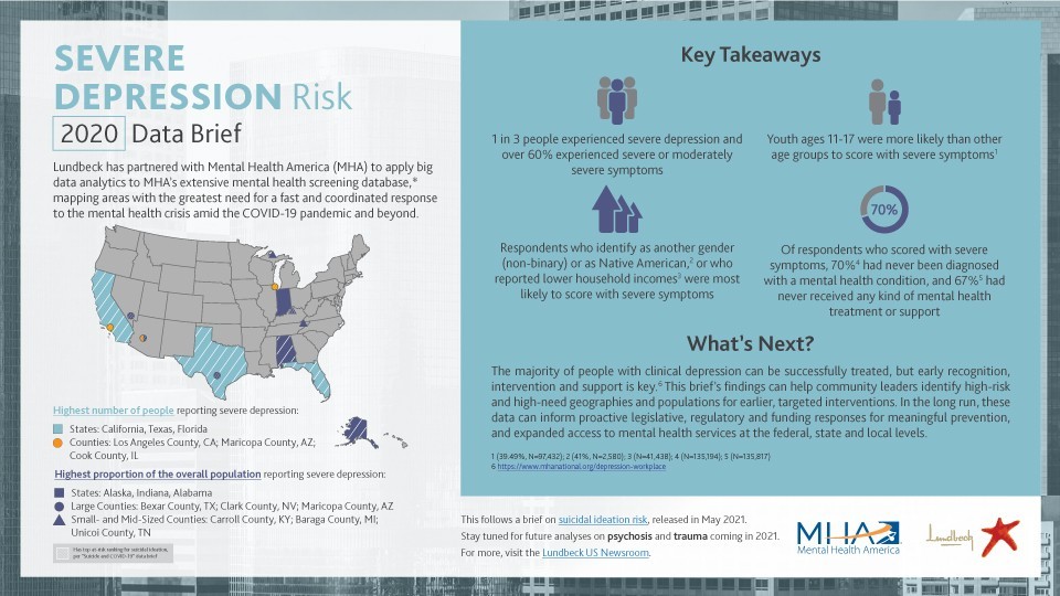 Alexandria, VA and Deerfield, IL (August 19, 2021) – Today, Mental Health America (MHA), with support from Lundbeck, released a new brief, Severe Depression and COVID-19: Communities in Need Across the U.S., analyzing data collected from 725,949 individuals who took a depression screen (PHQ-9) as part of the MHA Screening Program in 2020. The analysis finds that 62 percent of people scored with symptoms of severe or moderately severe depression. Of those who scored with symptoms of severe depression, 70 percent had never been diagnosed with a mental health condition and 67 percent had never received any kind of mental health treatment or support.