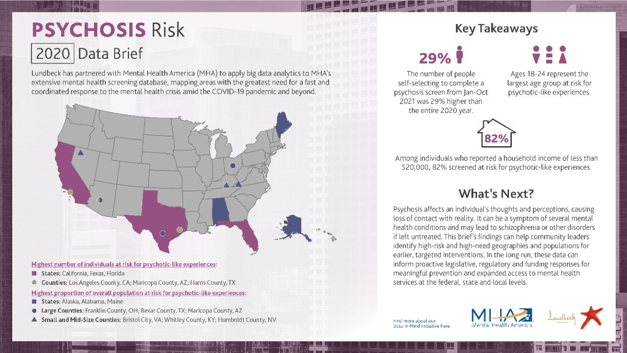 Evaluating responses from people who took a psychosis screen on MHA Screening can provide insight into how psychotic-like experiences affect different communities and support targeted interventions for undertreated populations across the United States. This analysis is unique in that it can quickly identify local areas, down to the county level, with the greatest need for a faster and coordinated response amid the mental health crisis exacerbated by COVID-19.