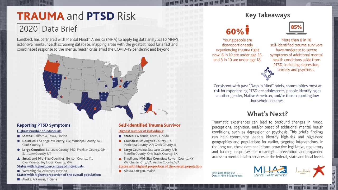 Alexandria, VA (October 13, 2021) – Mental Health America (MHA), with support from Lundbeck, today released a new brief, Trauma and COVID-19: Communities in Need Across the U.S., analyzing data collected from individuals who took a Post-Traumatic Stress Disorder (PTSD) screen and individuals seeking mental health supports who self-identified as trauma survivors through the MHA Online Screening Program in 2020 and early 2021.